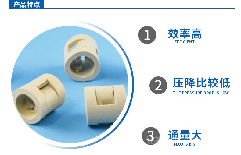 陶瓷鲍尔环拥有优异的耐酸和耐热性,能够并且能耐除氢氟酸以外的各种无机酸、有机酸及有机溶剂的腐蚀,并能够在高温或者低温的环境下使用,因此其使用范围非-常广泛。